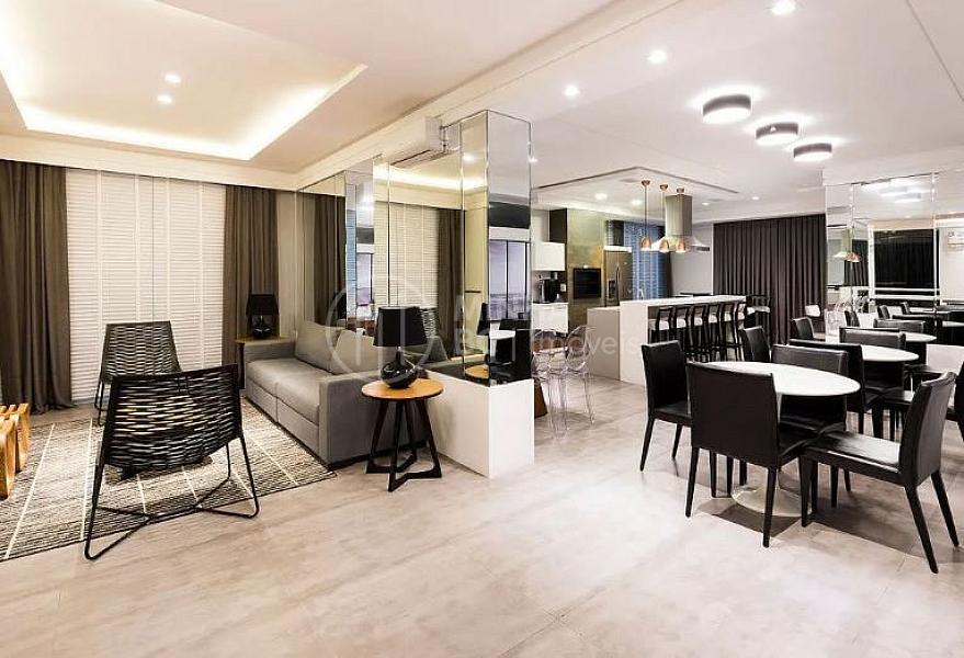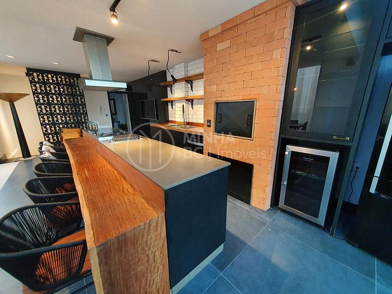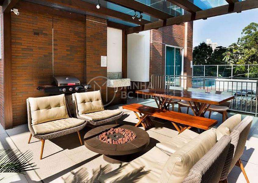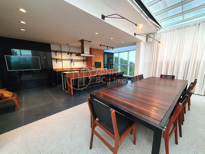 Essa cobertura duplex conta com 3 suítes e 4 vagas de garagem, em seu segundo andar está o espaço gourmet com churrasqueira a carvão e piscina privativa.